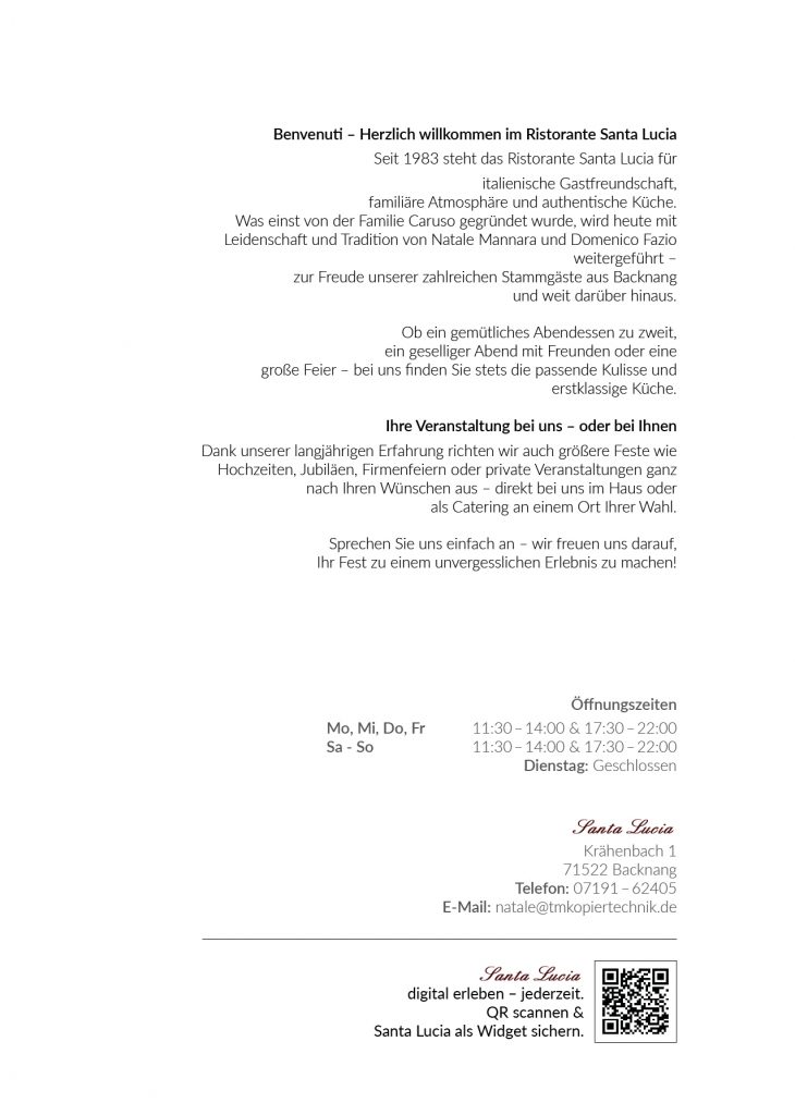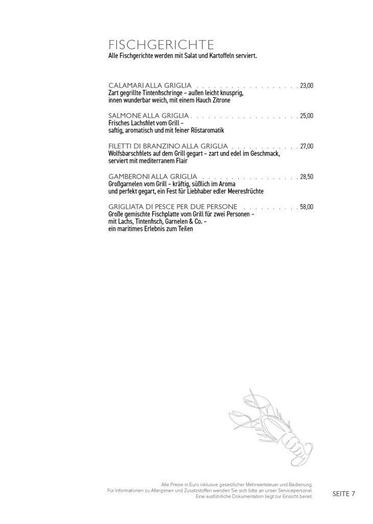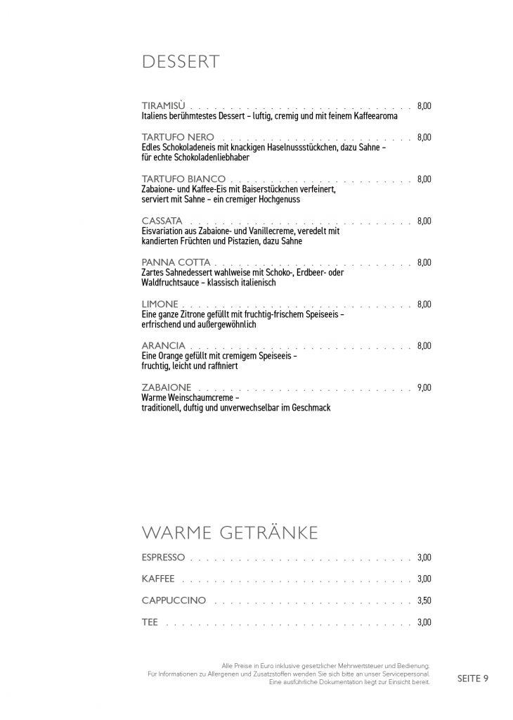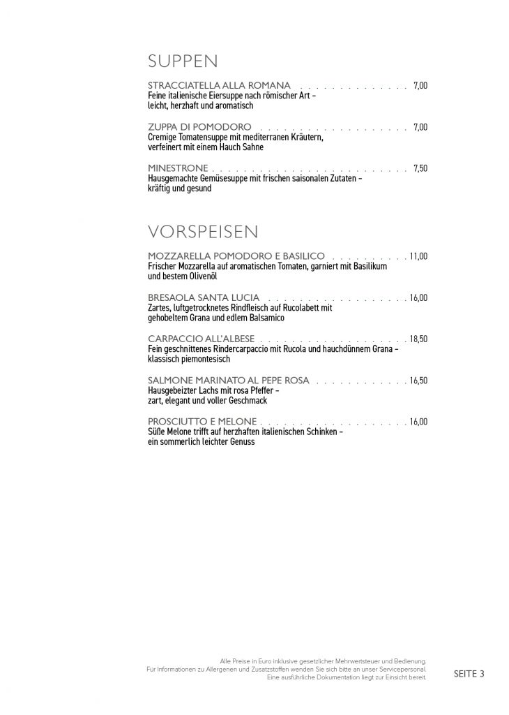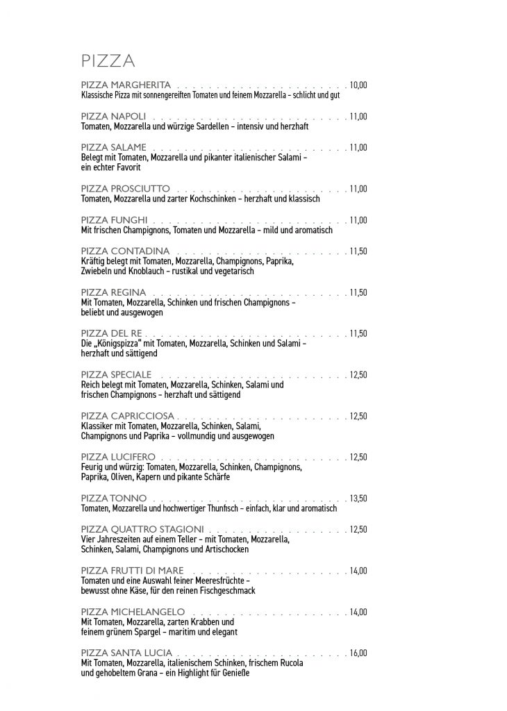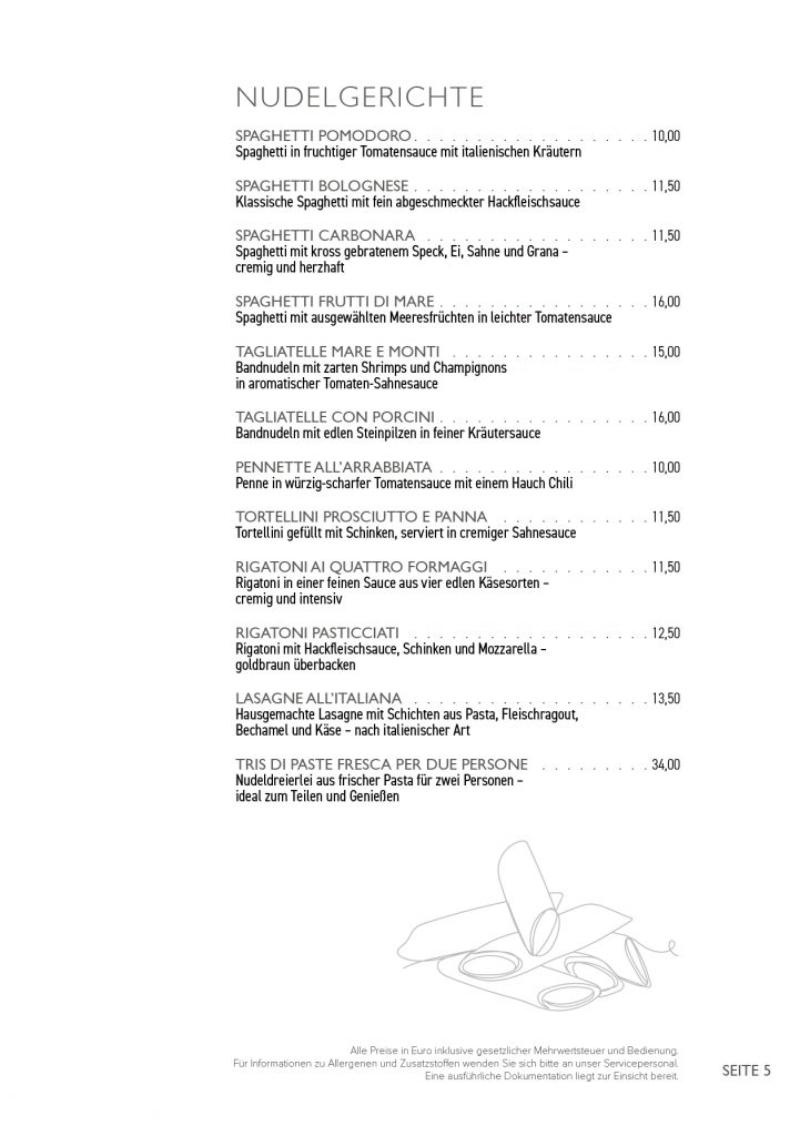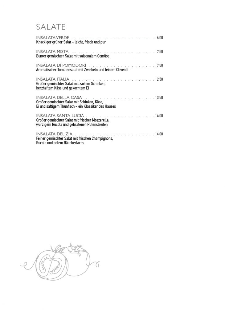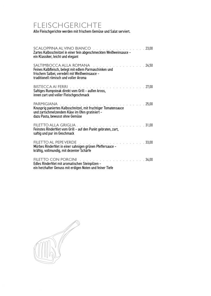 Unsere Speisen werden mit viel Liebe und den höchsten Standards an Qualität zubereitet und für Sie angerichtet. Abgesehen von unserer Speisekarte, in der Sie alle italienischen Gerichte finden, die Sie sich wünschen können, bieten wir wechselnde Wochen- und Tageskarten sowie Menüs für Feiern und festliche Anlässe an.